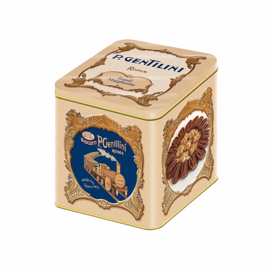 L’eleganza di questo scrigno è da ammirare in tutti i suoi dettagli, dallo splendido scorcio di Roma ai preziosi fregi liberty nei colori oro su fondo blu. Pregiata è anche la scelta dei biscotti con i Brasil, i golosi frollini al cacao da assaporare molto lentamente: un capolavoro di bontà.